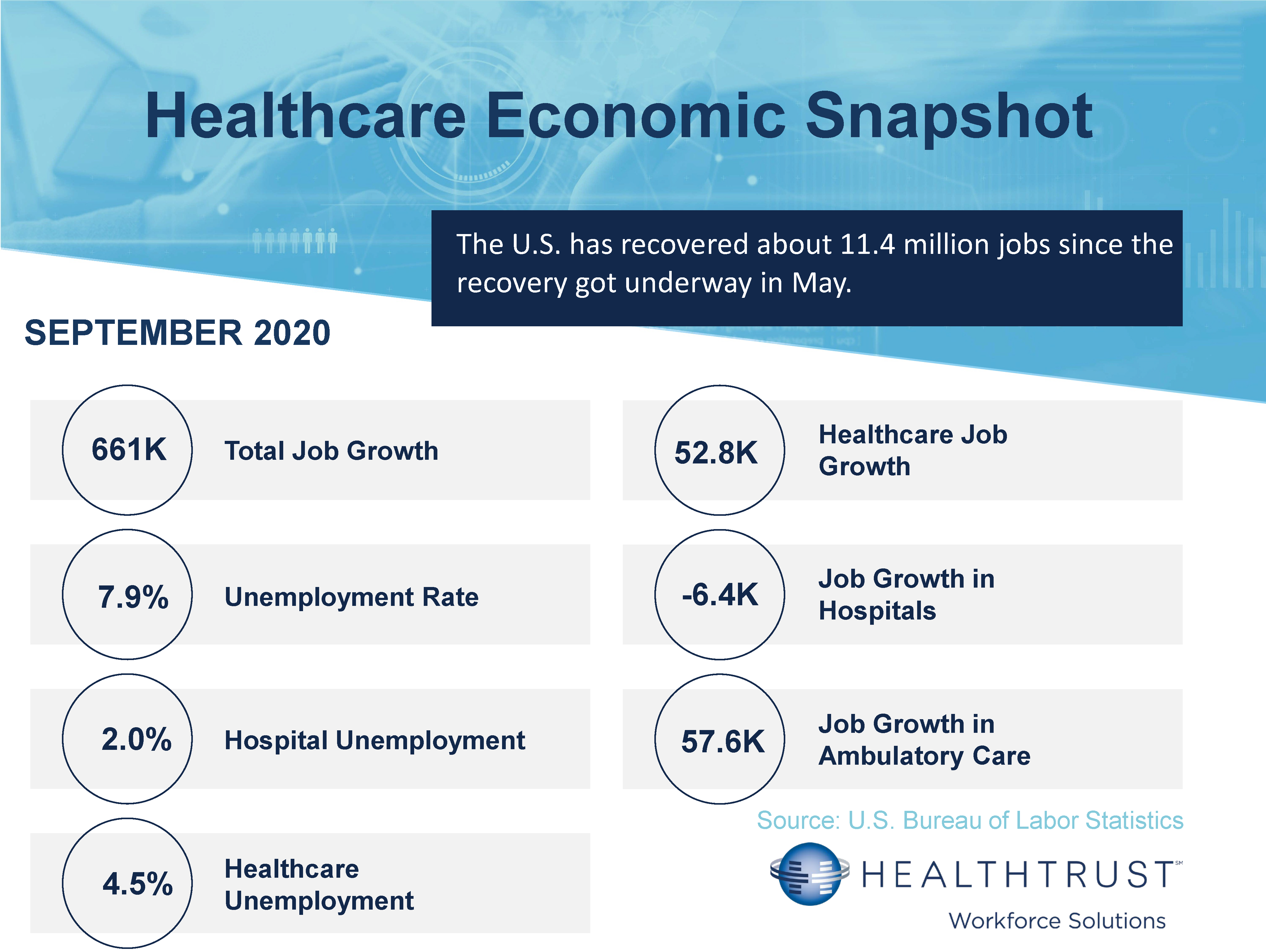 The October Bureau of Labor Statistics (BLS) 2020 Hiring Situation reported job growth of 638,000 new jobs last month, with the unemployment rate dropping down one percentage point to 6.9%. In October, employment in healthcare rose by 58,300 new jobs, with the largest gains occurring in ambulatory care settings (50,700) and hospitals (+16,200) These increases were partially offset by a decline of 9,000 in nursing and residential care facilities.